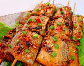 烤盘底部铺一层锡纸,并在锡纸表面刷一层食用油,带鱼用竹签串好摆在烤盘上。