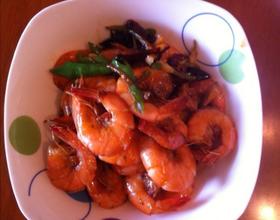 放虾炒,片刻后放味极鲜酱油,糖,闷一下,点盐、鸡精,出锅。