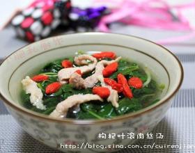 1.摘鲜枸杞叶时要注意枝上的刺,以防刮伤(也可以在市场买摘好的,这样更方便)2.加入枸杞叶之前要放适量的盐、油,并不宜加热过久,以免变黄3.瘦肉可换成猪肝,清肝明目的效果更佳,但俺不喜欢吃猪肝,所以换成瘦肉了,哈哈