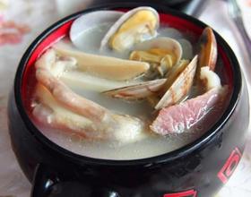 1.如果没有太多的时间也可先将鸭掌先入高压锅煮烂再进行煲汤。2.花蛤买回家后要用淡盐水浸泡2——3个小时,可以让花蛤吐尽泥沙。3.煲汤要注意一次加足冷水,中途不要添水,这样蛋白质才能够充分溶解到汤里。4.熬汤最好是用冷水,一开始就往锅里倒热水,肉的表面突然受到高温,肉的外层蛋白质就会凝固,使蛋白质不能充分地溶解到汤里。5.熬汤不要过早放盐。