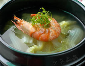 锅里虾干煮十分钟后,开盖放入娃娃菜,