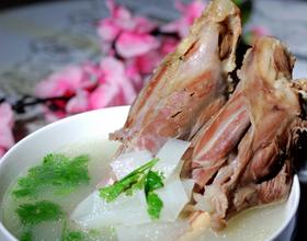 取汤锅一次加足水放入葱姜蒜,料酒,开锅下入羊腿,小火炖90分钟,汤汁浓白放入盐,白胡椒,鸡精,撒上香菜即可!@