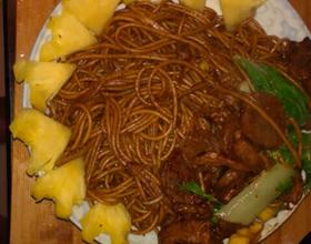 - 9. 先加入面面翻炒几下,然后加入青菜和菠萝,再翻炒几下就可以出锅啦