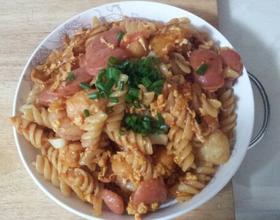 先将面煮熟捞出备用,用少许盐和海鲜酱腌制!