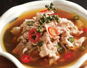 - 4. 原锅再次煮沸,放入肥牛片汆烫片刻后捞出,放在黄瓜丝、豆芽上,淋入步骤二的汤汁。