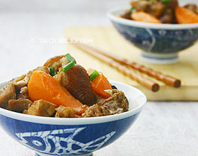 热锅落油爆香姜片,落兔肉炒香,边蘸酒边兜炒,炒出香味后放白糖、生抽炒匀,放适量清水煮沸倒进砂煲继续炆。