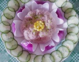 把切成莲花状的洋葱摆入肉饼周围成莲花形。