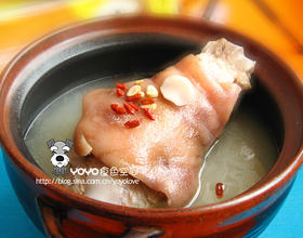 去除血水的猪肘,加入党参、淮山、姜片,加足清水上火煲开。