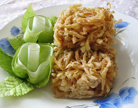 锅中烧油,要一点一点放入面条炸至金黄色捞出。