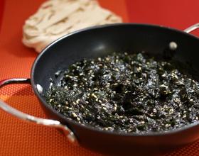 海带搅成泥,海苔用开水泡一下,捞出挤干水。锅中放葱油,油热后下海苔,再放海带泥炒,加入芝麻、糖、盐、大蒜粉,拌匀。