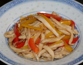 起锅热油,下杏鲍菇煸炒出水分,加入素耗油继续翻炒,出锅前加入红黄柿子椒,继续大火翻炒数下,加入蘑菇精,再翻炒两下,出锅!