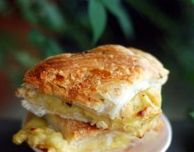 一半飞饼覆盖在另一半飞饼上,饼的圆形周边用手指压紧。