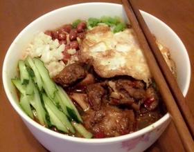 - 1. 先要将所有东西都准备好。小葱、大蒜子切成末,黄瓜切丝,煎好鸡蛋,用温温的食用油炒好花生米,然后把油烧热浇到辣椒面上,做成辣椒油。同时,将排骨炖煮做成鲜美的汤料,记得放几根生姜丝,去腥味。炖过的排骨捞出来,用热油爆炒一分钟,加少量水和酱油红烧,然后汤汁变浓时,加入鸡精、盐、孜然、干辣椒,待汤汁收完,盛出来备用。