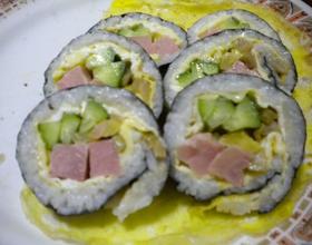 鸡蛋下锅拎成鸡蛋饼 将紫菜铺在竹帘子上 放入鸡蛋饼 铺上一层大米饭