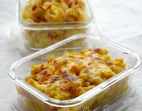 - 11. 把炒好的咖喱腊肠土豆泥装进耐热容器中;