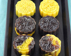 - 6. .包好的生胚放入模具中。想要黄色的就把黄色的饼皮放在花片的一边。喜欢黑色的就反之。