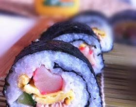 将适量白糖和白醋加几滴香油调成味汁倒入热米饭内搅拌均匀;卷帘铺上海苔,再铺一层米饭压平,一次码上鸡蛋条、黄瓜条、蟹棒和拌好的金枪鱼沙拉。