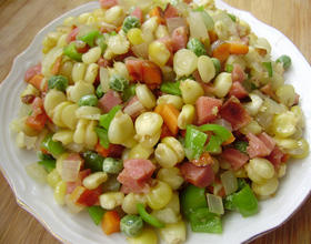 - 7. 翻炒均匀,倒入玉米粒,豌豆粒。