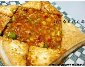 豆腐切三角型,平底锅放底油,小火煎豆腐,直到表皮呈金黄色。