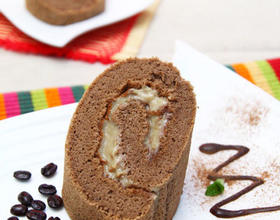 烤好立即出炉倒扣在架空的烤架上(烤架翻转180度,底朝上,下面空出的散热空间能更好的帮蛋糕体散热)。 - 10. 蛋糕放凉后翻过来,在蛋糕体上均匀抹上一层咖啡蛋乳泥;用刀在蛋糕体头前2CM处切一道,别切到底(有助于在卷蛋糕的时候蛋糕体的卷取)