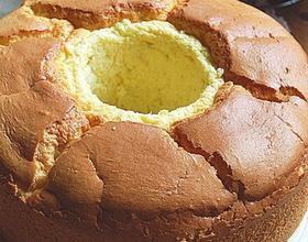 - 4. 拌好的蛋糊轻轻倒入烤模,并轻震几下赶掉大气泡;(我没有震气泡。因为家里没有8吋的戚风模,只有17cm跟21cm的,于是就用8吋活底圆模自己山寨了一个,倒进蛋糊后就不敢再乱震乱动了,担心里面用锡纸包好的纸杯被震移位,所以请忽略蛋糕中部分的小气泡哈)