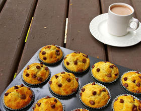 - 4. 混合好的面糊,倒入纸模中,2/3满即可,表面再撒上剩下的另一半巧克力豆。