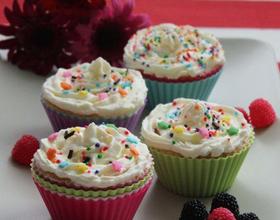 (可做4个直径7CM硅胶杯子模) 1.拌好的面糊挤入模具里要挤满; 2.表面装饰的打发淡奶油糊、彩糖珠、朱古力针也可省略。 3.测试蛋糕有没有烤熟,可以用牙签插入蛋糕里,如果牙签上没有黏糊糊的东西,说明蛋糕已经烤熟。