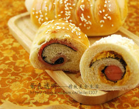面团分成每个60克,滚圆松弛15分钟后。取一个小面团擀长,放入一层肉松,上面加上一片海苔,海苔上面是半根火腿肠。卷成卷后放入烤盘。