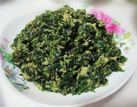 将蛋液缓缓倒入炒断生的枸杞芽上。