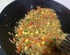 最后加入之前的配料,炒至干身,一定要粒粒饭都要分开的,上碟即可