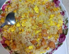 洋葱切成碎粒玉米肠切丁鸡蛋打散锅内加油油热后放入洋葱碎玉米肠粒炒香倒入米饭炒散加盐调味翻炒均匀盛盘