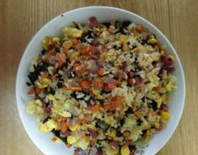 热油炒鸡蛋,出锅备用。锅中倒少量油,按顺序煸炒胡罗卜,洋葱,黑木耳,广味小香肠,甜玉米粒,炒好的鸡蛋,拌好蛋液的米饭,3一5分钟后放食盐,鸡精,香油,出锅。