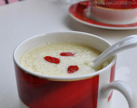 将果饮倒入小奶锅中,加入枸杞子,灶火上加热煮开锅即可饮用。