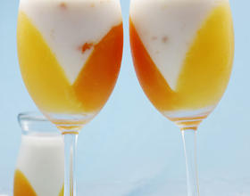 待橙果冻完全凝固后调转红酒杯,在另一侧倒入百香果果冻液,冷藏至凝固。