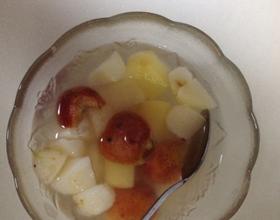 加水和水果丁一起入锅煮,煮开后加入适量冰糖再煮一会,加入一点枸杞就可以关火了,这样一碗适合小朋友吃的水果甜汤就完成了,啰嗦一句,一定要冰糖,才有鲜甜感,水果可以根据家中水果调整,不过山楂开胃,枸杞健脾可以放点,但山楂酸,适量即可