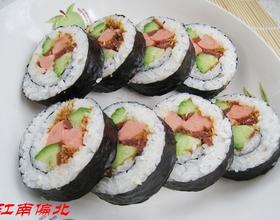 然后用寿司帘慢慢卷起、整形、卷的守候稍微用点力。