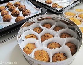 不用刻意整形,要保证同一烤盘内的每块饼干大小尽量一致,以免出现有的已经烤熟了,有的还没有熟的情况。 如果是生核桃仁和大杏仁,可以用烤箱180度预先烤几分钟,把果仁烤出香味。冷却后再使用,做出的饼干会更香。 如果没有巧克力豆,也可以把整块的黑巧克力切碎来代替