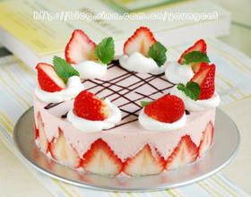 取慕司模,于底边先围上一圈切半的草莓,中间放上一块蛋糕片,倒入二分之一的慕司,再于中间放上一片蛋糕片,倒入剩余的慕司,放入冰箱冷藏4小时以上