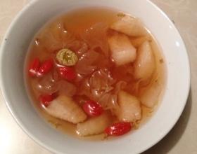 - 5. 待5分钟后,将雪梨、银耳、桂花放入锅内,继续文火炖煮,待银耳煮糯,出部分的胶质后在放入枸杞,继续炖煮