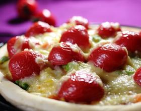 饼皮底部抹些橄榄油,饼上涂满披萨酱,撒一层马苏里拉乳酪丝,铺上肉肠,洋葱丝,玉米粒,青豆,胡萝卜丁,切半番茄,最后再撒一层乳酪丝,多撒点儿。