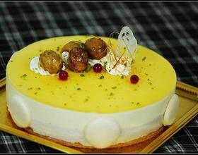 把百香果奶酪馅倒入到模具中刮平 ,冷冻凝固 - 5. 做镜面(这里没拍照片,时间已经很晚了),把百香果蓉加水加热,加入泡软的吉士丁片,融解微凉后倒入在蛋糕表面至凝固 ,最后脱模装饰