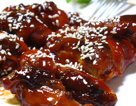 - 5. 鸡腿放入盘子中,用刀切片,烧上剩余的一点点汁,上面撒些白芝麻。