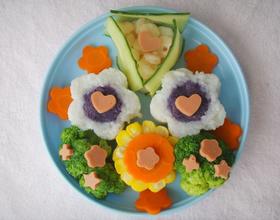用花朵模具压好米饭,在中间留个洞,用圆型模具放入紫薯泥做花蕊。