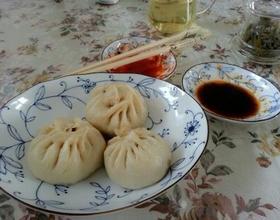 - 7. 将面团揉好后,分成几块,先搓成一条,然后再揪成大小如兵乓球一样的面剂子。把面剂子用手压平,用擀面杖擀成中间略厚的圆形的包子皮。一手托着包子皮,另一手用筷子将馅料放在正中,用右手的大拇指,食指和中指相互配合捏褶,左手转动包子皮,右手捏压上端的面皮使其封口。