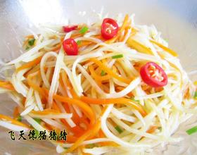 胡萝卜丝和土豆丝捞出后沥干水分,然后放在容器中。
