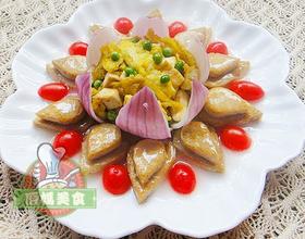 - 9. 炒好的豆腐填在盘中间一些,挑选几瓣大小一样的洋葱摆在豆腐中间做荷花瓣。