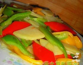 土豆片洗净淀粉后不糊锅,并且口感很脆,一定要快火急炒,以保证彩椒颜色和土豆的脆感。