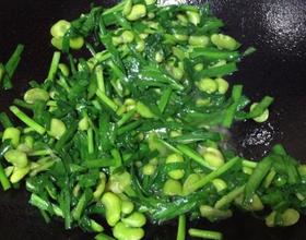 热油下豆米,加盐胡椒鸡精一勺水将豆米炒熟。