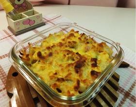 - 6. 把超好的馒头丁,放入耐高温的器皿中,上面铺上一层马苏里拉奶酪。
