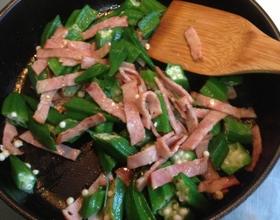 看到培根肉酥吐油后,放入切好培根翻炒几下就可以出锅了!不要放盐,培根本来就有咸味,秋葵过水也放过盐了!所以最后不要盐了!